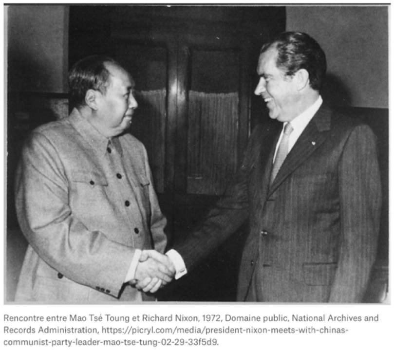 Confrontés à l'impasse de la guerre du Vietnam, les États-Unis ont alors opéré un tournant stratégique et se sont rapprochés de la Chine. Ce rapprochement a été symbolisé par la rencontre historique entre Richard Nixon et Mao Tsé Toung au début des années 1970, illustrée par la célèbre photographie de leur poignée de main datant de 1972. Préalablement à cette rencontre, les États-Unis avaient reconnu les autorités de Pékin comme le gouvernement légitime de la Chine. Par la suite, ils ont retiré leur reconnaissance diplomatique à Taïwan et ont accepté le principe selon lequel Taïwan faisait partie du territoire chinois.