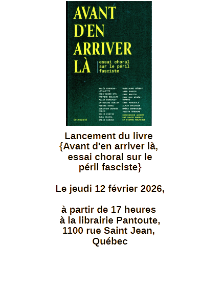 Le jeudi 12 février 2026, à partir de 17 heures à la librairie Pantoute,1100 rue Saint Jean, Québec