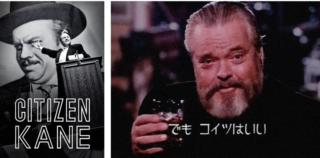 A la Cinémathèque française se tenait une exposition Orson Welles qui vient tout juste de se terminer. Tout un coin était consacré aux publicités dans lesquelles s’est illustré l’acteur-cinéaste à la fin de sa carrière. Dans le merveilleux spot publicitaire pour le whisky japonais Nikka G&G (1979), Welles a l’air de se demander ce qu’il fout là, et offre avec une malice et un égarement non dissimulés le spectacle de sa déchéance – le voilà tombé dans un monde d’images dégradées, passant de Citizen Kane, à ça.