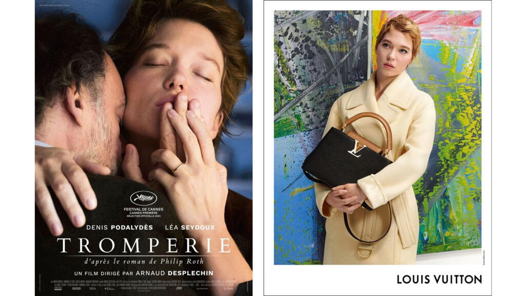 La chose qui m’avait frappée, c’était que la sortie du film était précisément calée sur une nouvelle campagne publicitaire Louis Vuitton. Dans le métro comme sur la façade des kiosques à journaux, on pouvait contempler les très belles photos de l’actrice, “nouvelle femme Vuitton” depuis 2016, où le sac hors de prix devenait plus qu’un épiphénomène. L’objet siglé dialoguait en bonne intelligence avec d’autres œuvres d’art : il y avait Léa, splendide, mais aussi, juste derrière elle, des tableaux de Gerhard Richter ou de Joan Mitchell, à qui on n’avait rien demandé, pas même l’autorisation d’utiliser leurs œuvres dans une publicité – si les héritiers de Joan Mitchell ont demandé que l’on retire de la circulation les photos incriminées, Richter, lui, est resté silencieux. Il a aujourd’hui une grande rétrospective à la Fondation Vuitton.
