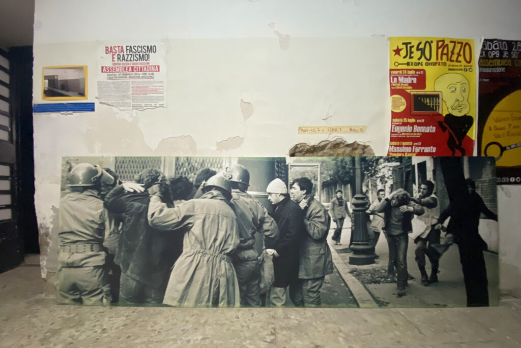 On fait cette proposition à des gens qui, après, nous ont donné raison et sont entrés dans Potere al popolo, mais qui à ce moment-là ne faisaient pas confiance au principe des élections. Et tout ça, c’était janvier 2015, tout de suite après la victoire de Syriza : nous, on a dit : « Il se passe quelque chose au niveau européen. Il faut profiter de ça. » Beaucoup de gens nous donnaient raison, mais on n’a pas réussi à les convaincre de nous rejoindre. Alors on s’est dit qu’il fallait montrer que cette nouvelle approche, qui continue une histoire mais qui essaie d’être un peu plus dynamique, un peu plus « communicative », consistant à mettre au centre les besoins des gens, reposant sur l’écoute et l’aide directe, était la nouvelle forme de construction du parti. On s’est dit qu’il fallait l’expérimenter, parce qu’on ne peut pas convaincre les gens en parlant : il faut démontrer par la pratique. Donc on occupe l’ex OPG3 avec, dès l’origine, au cœur du projet, un but politique de construction de l’organisation. On y entre le 2 mars 2015, avec déjà pas mal d’expérience d’occupations à notre actif – moi j’ai commencé à treize ans ! – et on ne voulait surtout pas faire une occupation à la mode « politique », pour les jeunes, pour les antagonistes, pour les gens habillés en noir avec un imaginaire Che Guevara… On voulait faire quelque chose de populaire : « populaire », dans une ville comme Naples, ça signifie par exemple utiliser des mots en napolitain, parler d’une manière très compréhensible, donc pas trop idéologique, partir des besoins concrets des gens et surtout organiser les gens.
